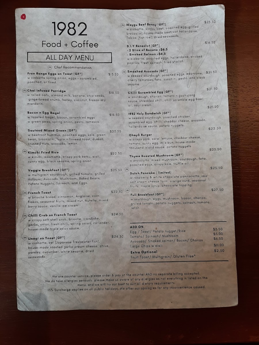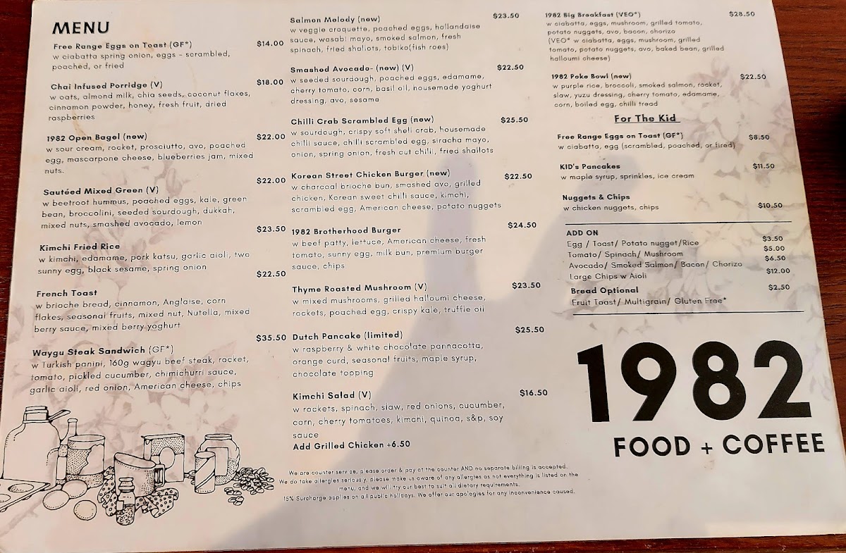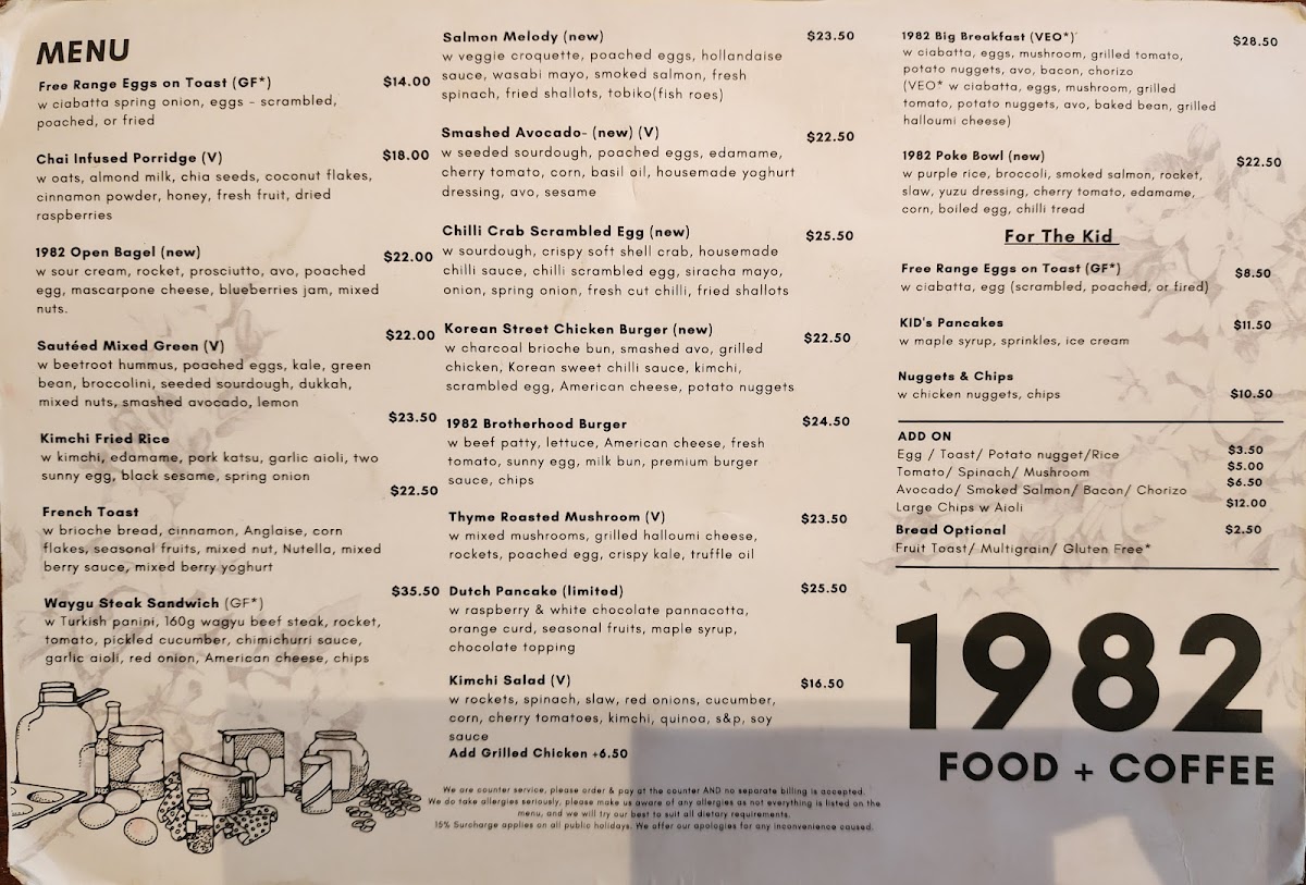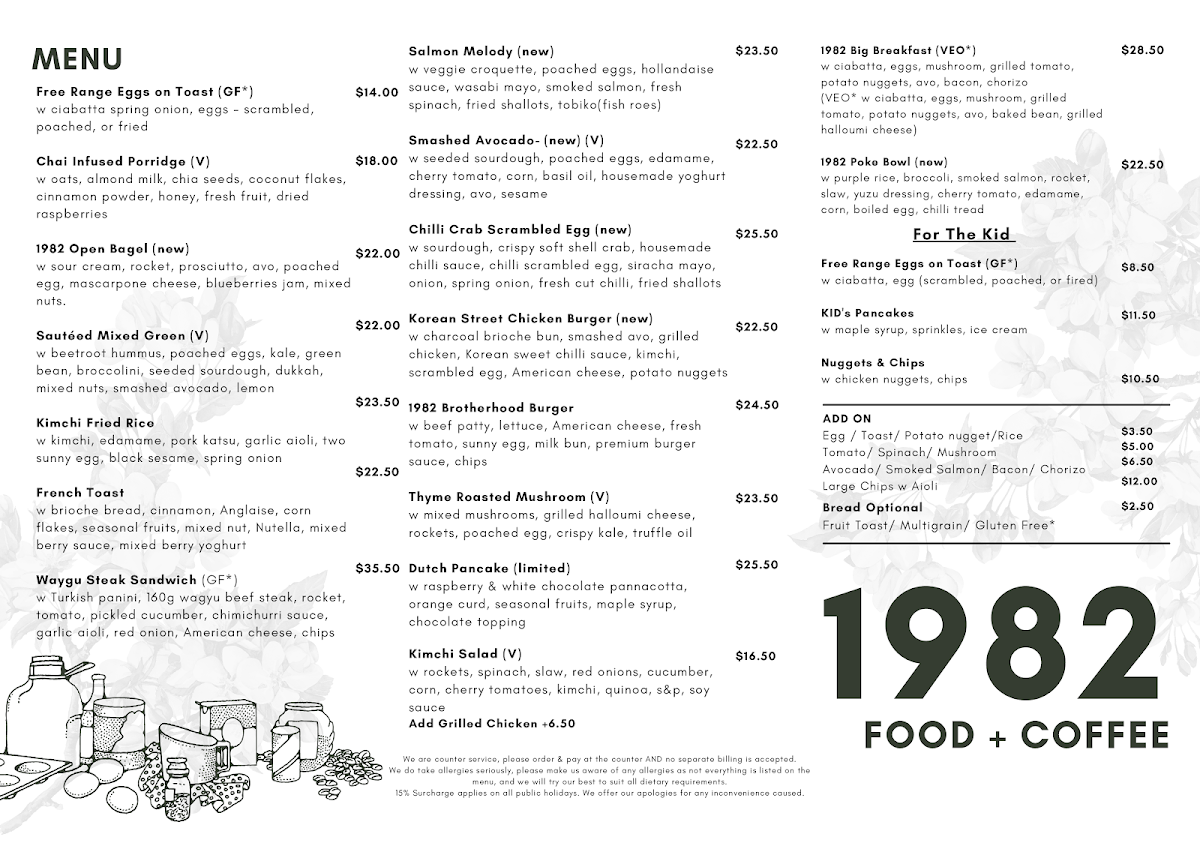 In conclusion, 1982 Food + Coffee offers a well-rounded menu that combines both familiar comfort foods and adventurous new dishes, ensuring there’s something for everyone. Whether you're in the mood for a quick bite or a leisurely meal, the variety and quality of options at this restaurant are sure to impress.