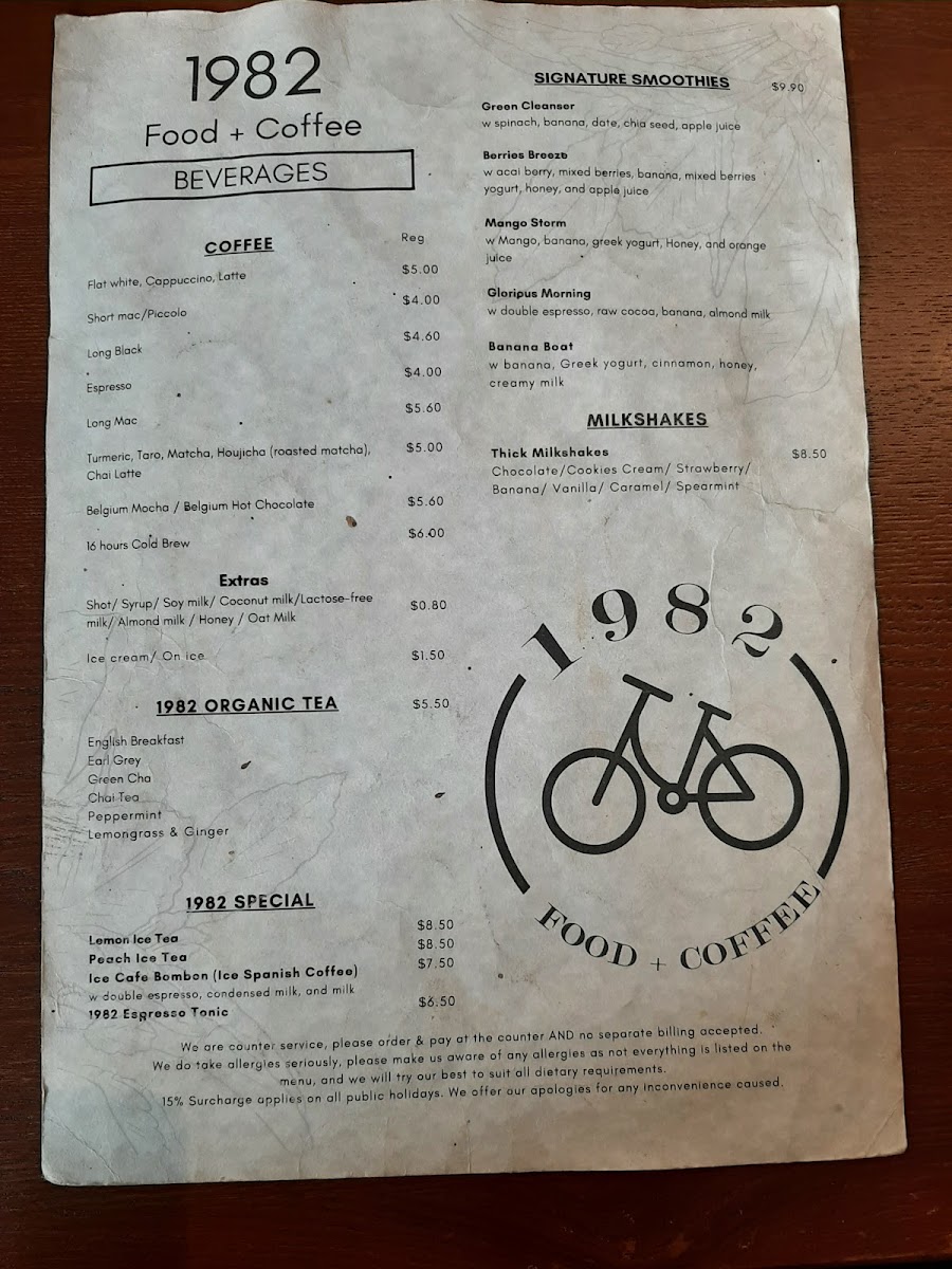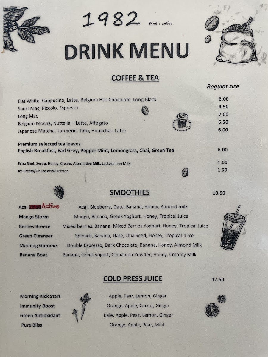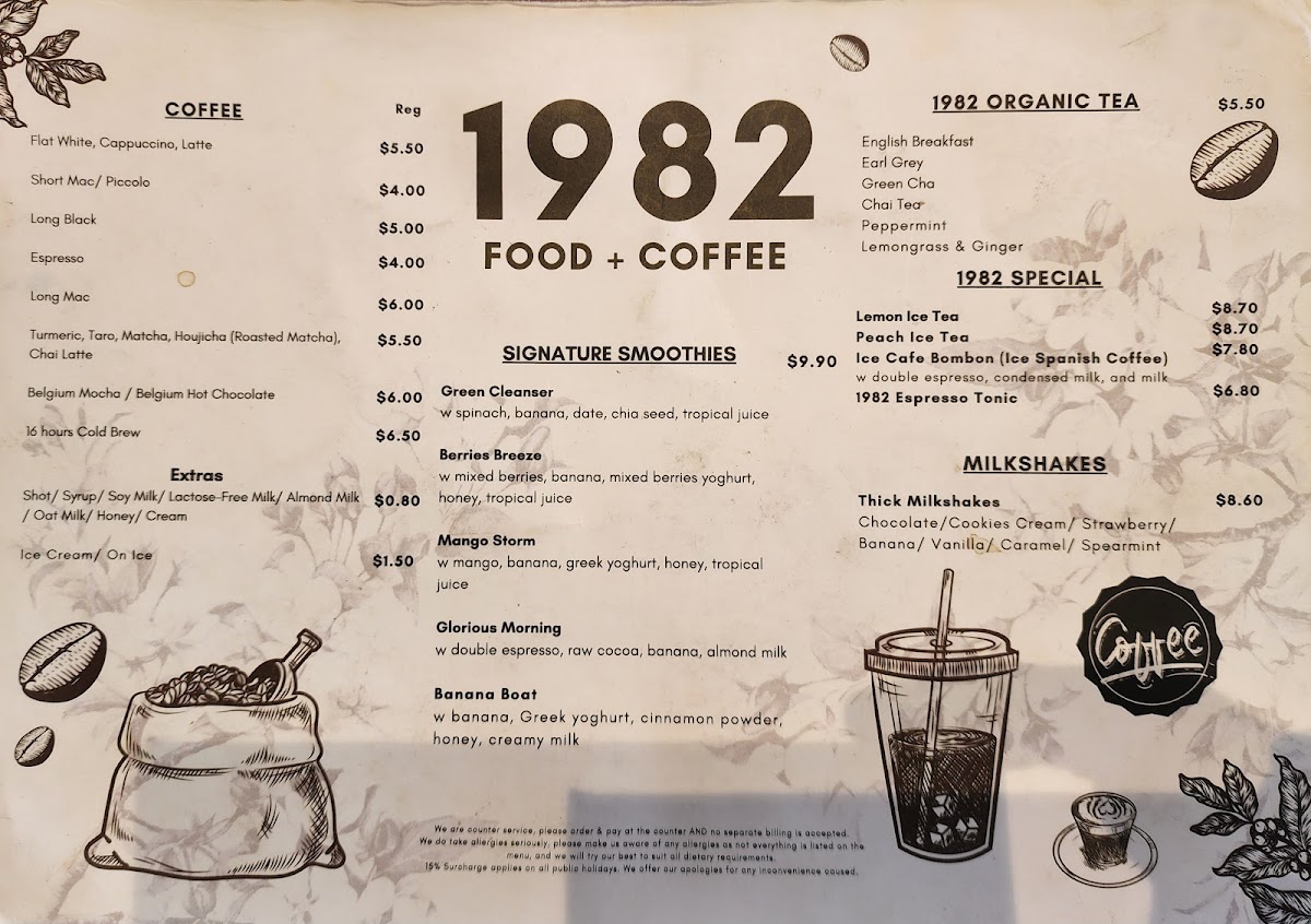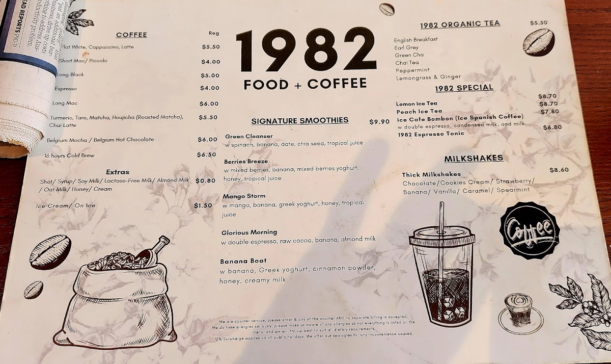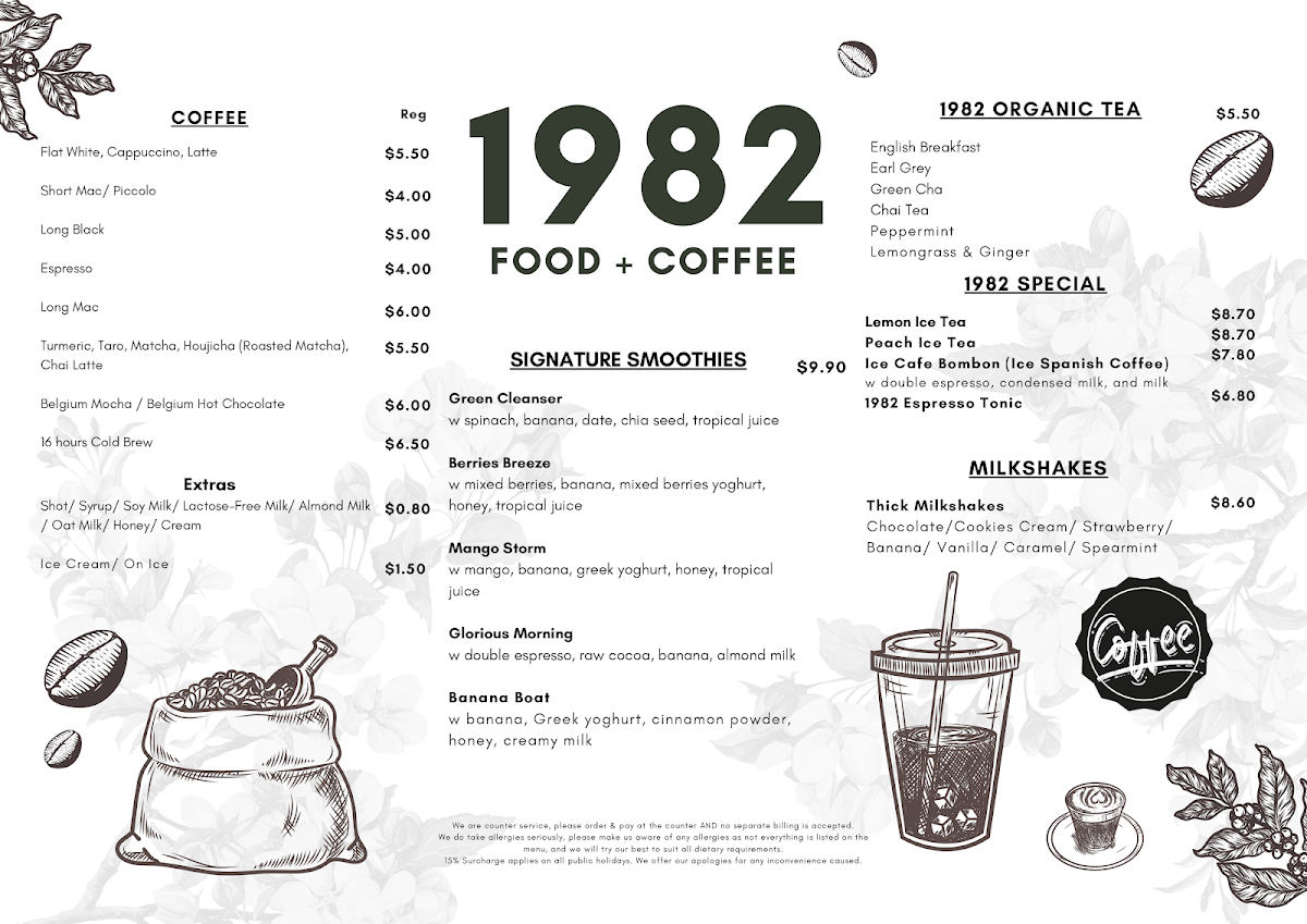 As for sides, the Large Chips W Aioli and Bread 1 Slice are classic accompaniments, while you can swap your bread for a croissant for an elevated experience. In terms of beverages, 1982 Food + Coffee offers a selection of organic teas, including English Breakfast, Earl Grey, and Chai Tea, as well as a range of coffee options like Flat White, Espresso, and Long Black. Those craving something more refreshing can enjoy 1982 Special Lemon Ice Tea, Peach Ice Tea, or Ice Cafe Bombon.