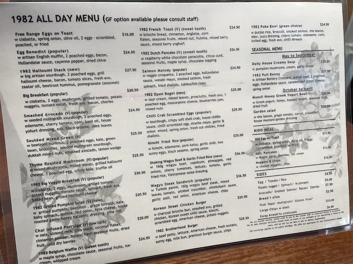 At 1982 Food + Coffee, located at 3/1 Rokeby Rd, Subiaco WA 6008, Australia, the menu offers a diverse range of options that cater to various tastes and preferences. The salad section features refreshing dishes like Steak Salad, Smoked Salmon Bowl, and Roasted Pumpkin Salad, providing a perfect balance of flavors and textures. For those seeking a heartier meal, the Steak Sandwich and Buttermilk Fried Chicken Burger are standout options, offering indulgent and satisfying choices. The 1982 Brotherhood Burger and Soft Shell Crab Burger offer unique twists for burger enthusiasts looking for something a little different.